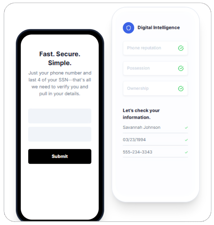 Pre-populate verified identity data using minimal input to drive faster, more accurate onboarding. Tap into the industry-leading Identity Graph and real-time risk signals to boost auto-fill rates, reduce abandonment, and improve conversion, especially for Gen Z and thin-file users. Lightweight APIs deliver seamless integration with low latency at scale.